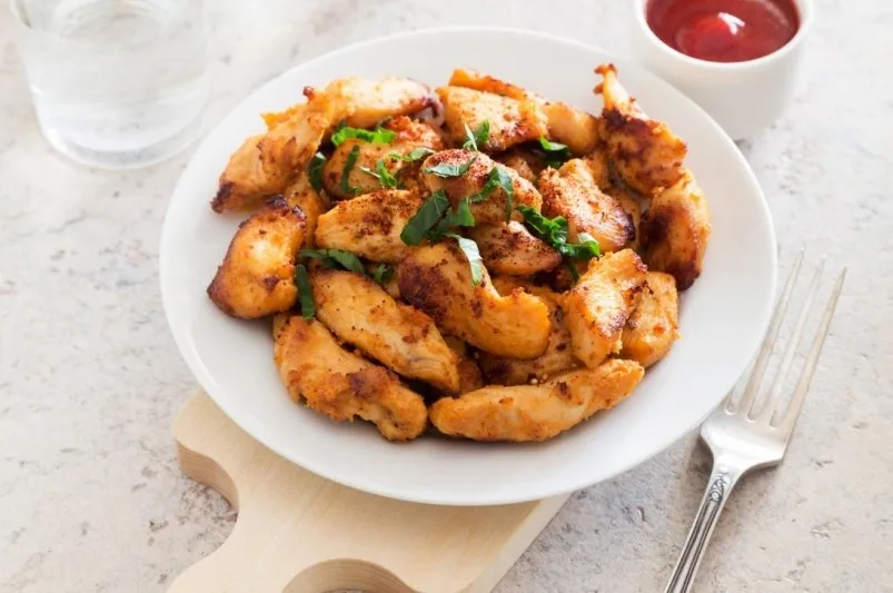 - Подача. Переложите готовые куриные кусочки на тарелку, посыпьте зеленью и подавайте горячими.